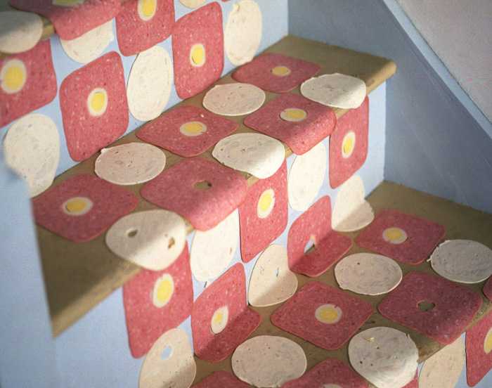 Via internet kwam ik een afbeelding tegen die ik zo grappig vond, dat ik wilde uitzoeken waar het in godsnaam over ging. Stel je voor dat je je keukenvloer letterlijk belegd met bruine en witte casino-boterhammen en dan in een blokjespatroon? Zie je het al voor je? Die foto bracht me op de auteur van het kleine boekje 'everyday dada'. Sian Bonnell heeft het uitgegeven in 2006 en laat op een grappige manier zien hoe je eten kunt toevoegen aan je interieur.